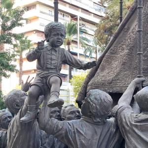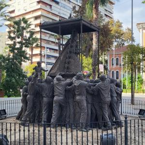 Cette imposante statue en bronze représente une scène de procession de la Pentecôte.