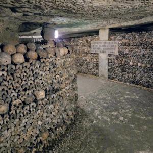 Au départ (au 18e siècle), les squelettes furent déversés en vrac dans les anciennes carrières (afin de vider les cimetières alentours), puis les gardiens des lieux se mirent à ranger les os de façon plus ou moins artistique pour passer le temps. Lors de votre visite (parcours de 1,7 km), vous pourrez voir des murs entiers de fémurs, de tibias, de crânes... Songez que parmi ces os anonymes, vous verrez peut-être les os d'illustres figures de l'histoire de France...