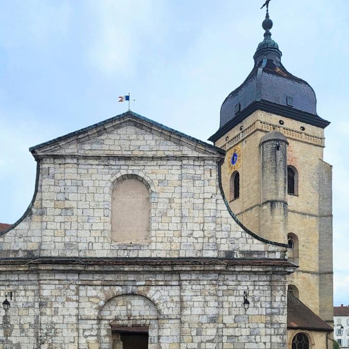 La particularité de cette église est sa façade postiche (une fausse façade) construite après l'incendie de 1736 pour s'harmoniser (être parallèle) avec la nouvelle place. Le style de cette église est roman / gothique / franc-comtois. Rappel: on reconnait le style roman (10e siècle) par son aspect massif; le style gothique (12e siècle) est plus raffiné et élancé; le style franc-comtois se distingue par la forme de ses clochers. Voir également la section ˝styles des églises˝.