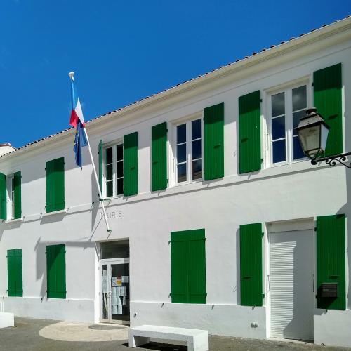 Une élégante mairie d'un blanc immaculé et aux volets verts.