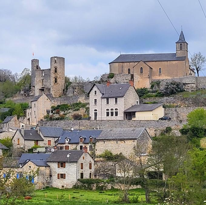 En passant sur la route nationale (N88), impossible de rater ce ravissant village et son château en ruine construits à flanc de rocher.