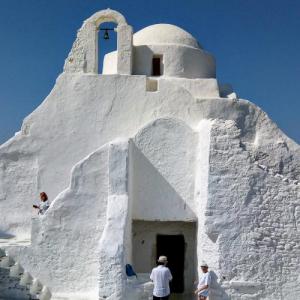 C'est l'un des édifices les plus photographiés de la ville, car c'est probablement l'une des églises les plus étranges au monde: une sorte d'igloo hellénique! Sauf qu'ici ce n'est pas de la neige mais des murs blanchis à la chaux. Il n'y a guère que la cloche et la porte qui n'aient pas été passés à la chaux. En Grèce, on utilise la chaux depuis l'Antiquité, ••• Question: pourquoi utilise-t-on de la chaux? ••• Réponse: par rapport à la peinture ou au ciment, la chaux est un produit respirant, l'eau ruisselle dessus, mais en revanche si un mur est humide l'eau pourra s'évaporer, un peu comme avec un K-way.
