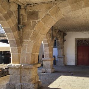 L'ancien hôtel de ville se distingue par ses tours crénelées et ses arcades.