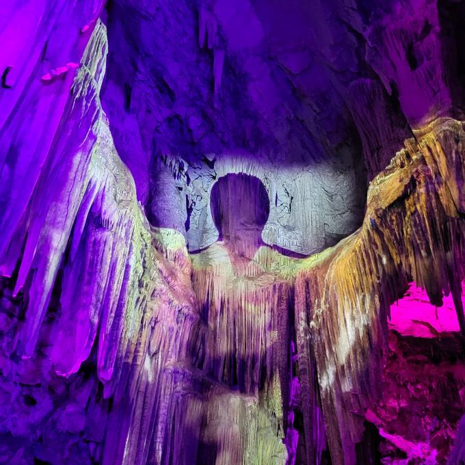 Une magnifique grotte dont les jeux de lumière dévoilent un gigantesque ange aux ailes déployées.